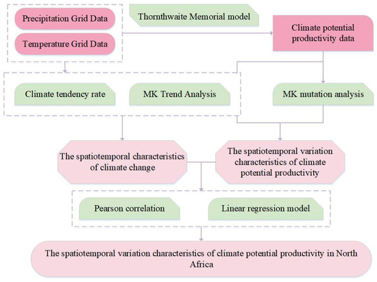 Climate tendency rate and MK trend analysis were used to analyze the spatio-temporal characteristics of climate change. The Thornthwaite Memorial model was used to quantify CPP data and to analyze the spatio-temporal variation characteristics of CPP in conjunction with MK mutation analysis. Pearson correlation and a linear regression model of CPP, temperature, and precipitation were then constructed in both the temporal and spatial dimensions. The framework of the study is shown in Figure 2.