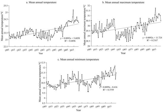 Variations in mean annual temperature (a), mean annual maximum temperature (b), and mean annual minimum temperature (c) in North Africa during 1901–2019.