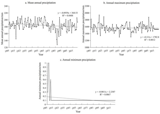 Variations in mean annual precipitation (a), annual maximum precipitation (b), and annual minimum precipitation (c) in North Africa during 1901–2019.
