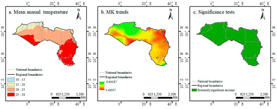 Mean annual temperature (a), MK trends (b), and significance tests (c) in North Africa during 1901–2019.