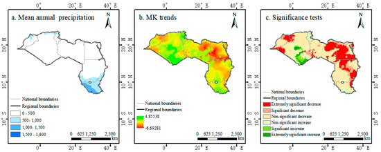 Mean annual precipitation (a), MK trends (b), and significance tests (c) in North Africa during 1901–2019.