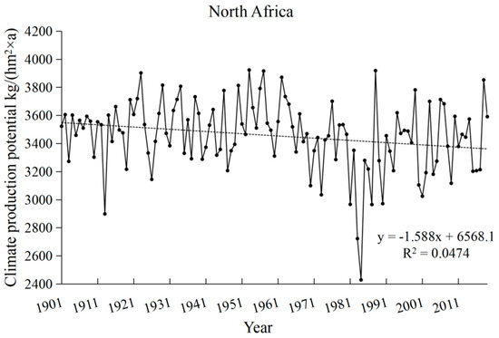 Africa is becoming one of the most sensitive and vulnerable regions of the global ecosystem due to its variable climate, complex topography, and diversity of natural ecosystems. In the context of global warming, climate change not only alters the spatial distribution of temperature and precipitation in North Africa, but also affects the spatial distribution of vegetation as well as the structure and function of ecosystems, causing changes in the North African ecosystem and inducing a series of food security problems. In this regard, this paper analyzed the spatio-temporal distribution of climate change, climate production potential (CPP), and influencing factors in Africa based on meteorological data for 1901–2019, using the Thornthwaite Memorial model, Mann–Kendall mutation test, and Pearson correlation model. The results indicated that from 1901 to 2019, the CPP in North Africa decreased by 4.9%, while the region’s precipitation experienced a decline of 5.2%. The phased trend in CPP was consistent with the change in precipitation. Temperature and precipitation were the main limiting factors for CPP in North Africa, with precipitation being more limiting. In general, North Africa’s CPP was more sensitive to precipitation, and a continued ‘warm and dry’ climate in the future could lead to an increasing downward trend.