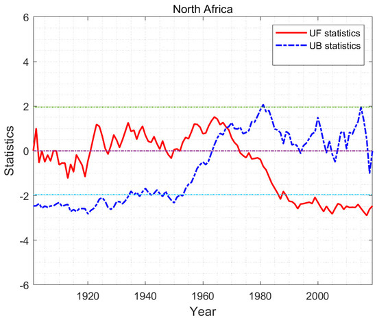MK mutation test for climate potential productivity for North Africa during 1901–2019. UF refers to a standard normal distribution, which is a sequence calculated according to time series. UB is applied to the inverse sequence of the time series.