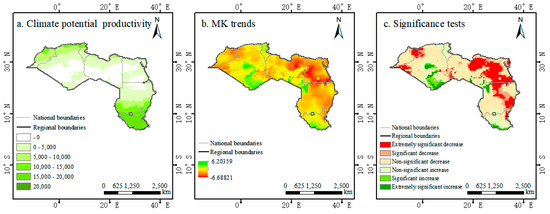 Climate potential productivity (a), Mann–Kendall trends (b), and significance tests (c) for North Africa during 1901–2019.