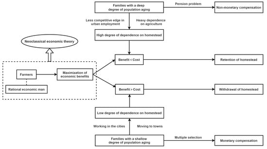 The essence of farmers’ withdrawal from the homestead is the disposal of homestead assets. According to the theory of neoclassical economics, farmers, acting as “rational economic man”, withdraw from their homesteads with compensation primarily to pursue the maximization of economic interests. Only when the risk associated with withdrawal from the homestead falls within the farmers’ tolerance, and the benefits derived from the withdrawal outweigh the associated costs, will farmers choose to withdraw from the homestead [].