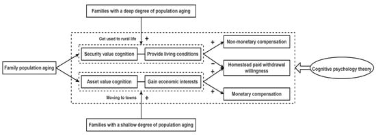 Theoretical Framework of Family Population Aging Affecting Farmers’ Willingness to Withdraw from the Homestead with Compensation and Compensation Preference through Farmers’ Cognition of Homestead Value.