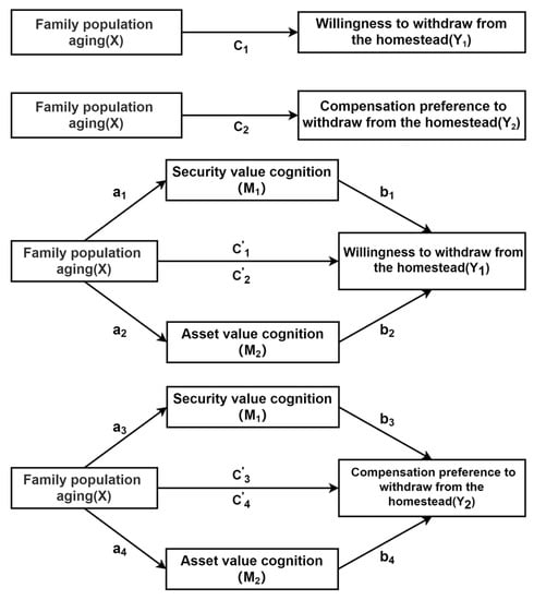 To further investigate whether the population aging rate of families has an impact on the willingness to withdraw from the homestead with compensation and the compensation preference through the cognition of the value of the homestead, this paper adopts the mediation test procedure proposed by Wen et al. []. The mediation effect is examined based on the total effect of the family population aging rate on the farmer’s willingness to withdraw with compensation and compensation preferences. The test process is shown in Figure 4, and the specific model is defined as follows:
