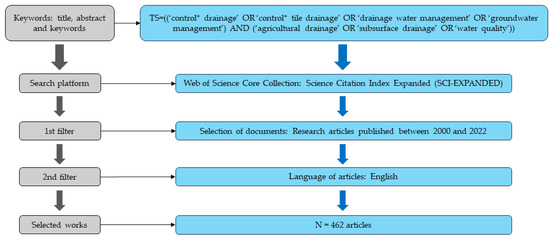 There are three different methodological phases, the first stage being the collection of literature data. A systematic literature review is conducted using an advanced search, using the following keyword sets in the Web of Science (WoS) Core Collection: Science Citation Index Expanded (SCI-EXPANDED). Scientific articles published in English were found based on abstracts, titles, and keywords published (i.e., TS field tag, search string ((‘control* drainage’ OR ‘control* tile drainage’ OR ‘drainage water management’ OR ‘groundwater management’) AND (‘agricultural drainage’ OR ‘subsurface drainage’ OR ‘water quality’))) between 1 January 2000 and 31 December 2022. The present bibliometric study is an analysis of the current state-of-the-art of the most relevant research papers on CD (Figure 1).