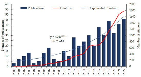 Exponential growth of the number and citations of articles published on the subject worldwide over the last two decades (2000–2022).