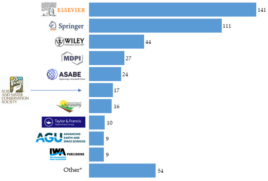 As shown in Figure 3, the order of publishers whose journals account for the majority of published articles is as follows: Elsevier, followed by Springer and WILEY (with a combined share of 64%). Moreover, 6% of the articles were published by MDPI, 5% were published by the American Society of Agricultural and Biological Engineers, 4% were published by the Soil and Water Conservation Society, 3% were published by the American Society of Agronomy and only 2% were published by Taylor & Francis, American Geophysical Union and International Water Association Publications.