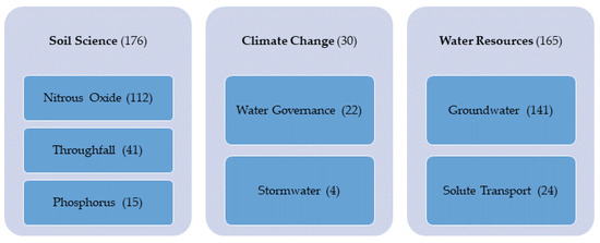 WoS allows the indication of research areas; 462 articles were assigned to the following three main Meso-Citation Topics (80%): 38% represent Soil Science, 6% are in the category Climate Change, and Water Resources represent 36% of the total. In the first category (Figure 4), three groups of Micro-Citation Topics were identified, the largest being those on Nitrous Oxide with 112 articles accounting for 24% of the total. In the other two categories, the most important micro topics are Water Governance (5%) and Groundwater (31%), respectively.