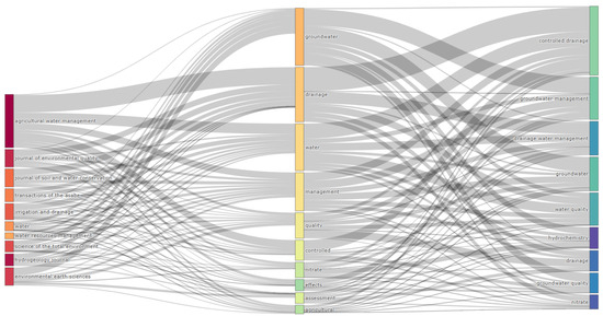 Figure 5 showed a three-field plot based on a Sankey diagram that depicts the connections from sources to titles and keywords. The height of the rectangle nodes is proportional to the frequency of occurrence of a certain source, title, or keyword within the collaboration network. The width of the lines between the nodes is proportional to the number of connections. The figure shows that ‘groundwater’ (frequency = 152) was the word in titles with the most connections, which was followed by ‘drainage’ (frequency = 145) and ‘water’ (frequency = 125). The top contributing source with ‘groundwater’ was Environmental Earth Sciences (21/152 = 13.8%), which was followed by Hydrogeology Journal (14/152 = 9.2%). With ‘drainage’, the top contributing source was Agricultural Water Management (46/145 = 31.7%), followed by the Journal of Soil and Water Conservation (17/145 = 11.7%). As for the keywords on the right, the most common words in titles contributing to the prevalence of ‘controlled drainage’ were ‘drainage’ (34.9%) and ‘water’ (21.8%). In addition, the top words in titles associated with ‘groundwater management’ were ‘groundwater’ (38.9%) and ‘management’ (18.5%).