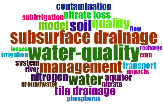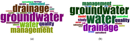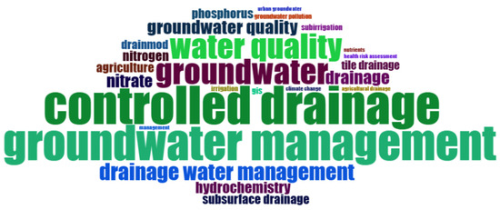 Figure 6 illustrates the word cloud of frequently occurring titles in research studies. A bigger word size and bold font emphasize the frequency and strength of sources (Figure 6). The word cloud represents visually the most frequent words used in relevant titles and abstracts of studies and helps identify the more important ones. The most dominant words in titles were groundwater (n = 196), drainage (n = 162), water (n = 133), management (n = 128), quality (n = 85), controlled (n = 60), assessment (n = 43), nitrate (n = 40), agricultural (n = 38), and effects (n = 36). However, the most frequent words in abstracts were water (n = 1672), groundwater (n = 1490), drainage (n = 1262), management (n = 712), quality (n = 675), study (n = 508), model (n = 405), controlled (n = 356), results (n = 322), and soil (n = 304).