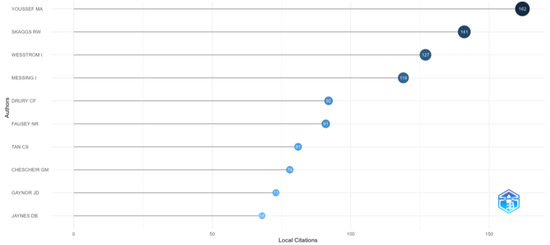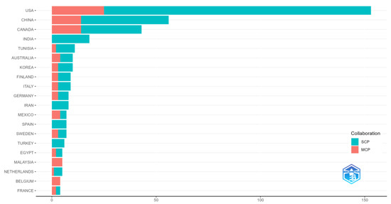 Figure 9 presents the ranking of the top 20 corresponding author’s countries. The USA had the highest total citations of 4.648, China had 1.899 and Canada had 966. In terms of publications, the USA led (n = 153), which was followed by China (n = 56) and Canada (n = 43). All in all, Figure 9 shows that these three countries were three leading countries in terms of total citations, number of publications, frequency of publications, single country publications (SCPs), and multiple country publications (MCPs).