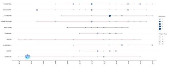 The top 10 authors’ research output over the past 22 years.