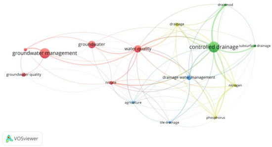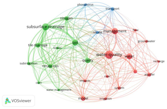 Based on an analysis of the KeyWords Plus, three cluster groups were identified (see Table 4). The first was marked in red with the most frequent word ‘water quality’, the second was marked in green with the most frequent word ‘subsurface drainage’, and the last was marked in blue with the most frequent word ‘transportation’.