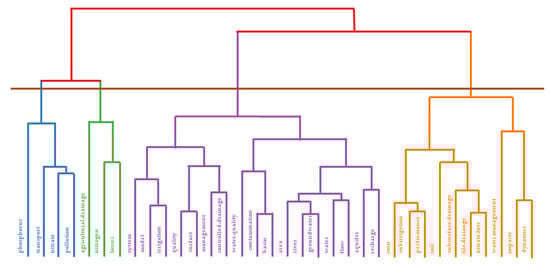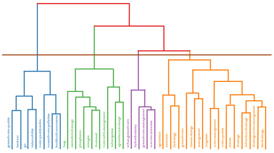 Figure 12 shows that the entire classification structure forms a tree dendrogram, displaying the close association between the author keywords in the field of CD. Also distinguished are four thematic groups, the first of which focuses on groundwater management in different areas. The second group includes words related to modeling the application of CD practice in qualitative aspects on agricultural land. How does the applied practice alone or with another, such as subirrigation, affect the ability to control outflow on a drainage facility? The last group consists of the largest number of keywords relating to the search for new methods within subsurface drainage with respect to withholding drainage runoff and the amount of nutrients.