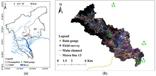 The Yonghe River Watershed (YRW) is located to the east of the central urban area of Guangzhou, China (Figure 1). The YRW covers two metro stations, Guanhu and Xinsha, that were completely flooded on 22 May 2020 (Figure 2). Moreover, some communities and villages in the downstream area were severely flooded, to depths of >1.5 m.