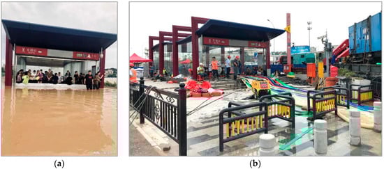Guanhu Metro Station during (a) and post (b) the flood. The photo (a) was taken on 22 May 2020, and sourced from Weibo, a public social media platform in China. The photo (b) was captured by the research team on 25 May 2020, when a rescue team was pumping flood water out from the metro station.