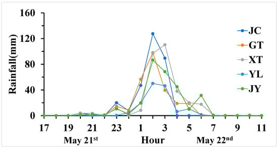 Rainfall data were collected from the official website of the Water Resources Department of Guangdong Province (http://210.76.80.76:9001/Map/Map.aspx?id=2, accessed on 6 October 2020). In 2020, the storm event occurred from 8 p.m. on 21 May to 7 a.m. on 22 May and peaked at midnight (Figure 3). The entire watershed was divided into subareas based on the locations of the weather stations using the Thiessen polygon method. Rainfall depths at the five stations are listed in Table 1.