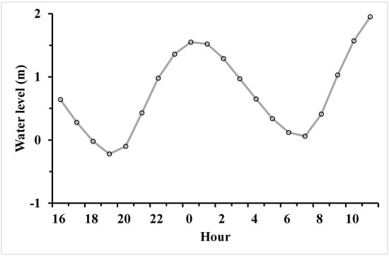 At approximately the same time, the tidal level peaked (Figure 4). Huangpu was the nearest tide station to the study area, and tidal data from Huangpu during the storm event were collected from the National Marine Data and Information Service’s website (https://www.cnss.com.cn/tide/, accessed on 6 October 2020).