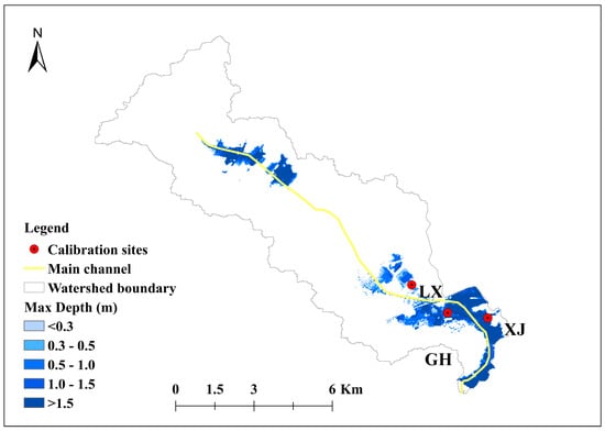 Simulated maximum inundation depths at Lixin Road (LX), Guanhu Station (GH), and Xinjie village (XJ) for the flood event on 22 May 2020.