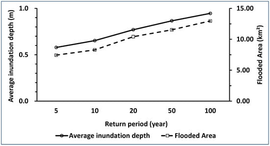 The increases in both the average inundation depth and flooded area exhibited nonlinear trends among the five return periods. The increase in inundation depth between the 5- and 20-year return periods (0.191 m) was larger than that between the 20- and 100-year return periods (0.176 m); similarly, increases in flooded areas were 2.986 km2 between the 5- and 20-year return periods and 2.546 km2 between the 20- and 100-year return periods, indicating a decrease in the rising rate.