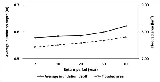 Average inundation depth and flooded area under rainfall scenarios in typical return periods.
