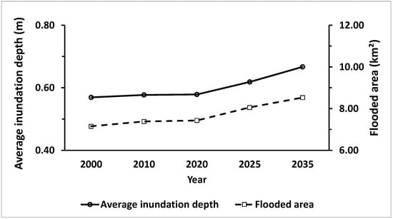 Flood responses to land cover changes are shown in Figure 8. The magnitude of change in flood indicators was between those in the rainfall- and tide-level scenarios. Both indicators showed an overall increasing trend. Average inundation depth increased by 17.2%, from 0.57 m in 2000 to 0.67 m in 2035. Flooded areas rose from 7.15 km2 in 2000 to 8.53 km2 in 2035, with a spatial expansion of 19.3%. Responses to land cover changes exhibited nonlinear trends like the responses to the tide levels. The rate of increase during 2020–2035 was found to be larger than that during 2000–2020, while the increase in inundation depth between 2000 and 2020 (0.009 m) was smaller than that between 2020 and 2035 (0.088 m). Increases in flooded area were 0.28 km2 and 1.1 km2 for 2000–2020 and 2020–2035, respectively, suggesting a stronger turn in the rising rate than the nonlinear trend in the responses to tide level.