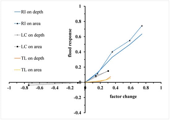 If a diagonal line starting from the original point is drawn in the upper right portion, most curves are under the line, suggesting that relative changes in influential factors do not induce the same amount of relative changes in flood depth and flood area. A probable reason for these outcomes is depth–area–volume relationship of detention areas such as floodplains, which could be simplified as circular cones. If water is continuously added to a circular cone, increases of water area and water depth triggered by a constant volume show a declining trend. Moreover, curve shapes are subject to floodplain topography.