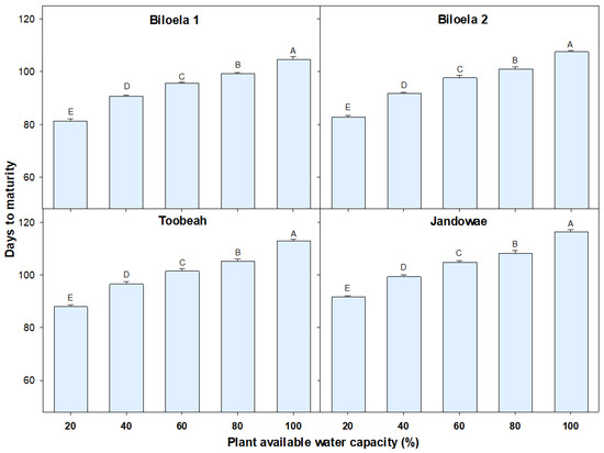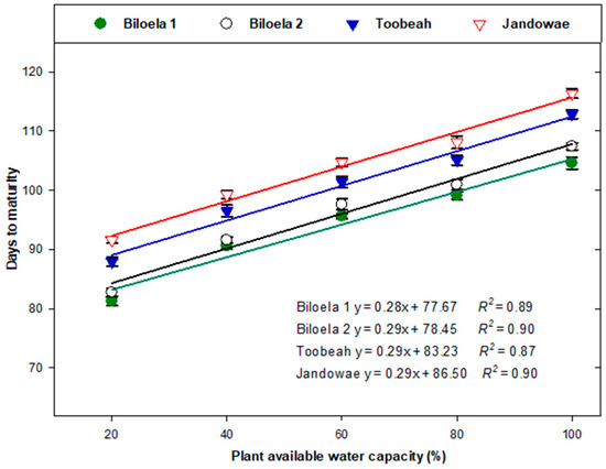 Soil water stress treatments had a significant impact in reducing plant maturity time in all biotypes (p < 0.001; Figure 2, Figure 3 and Figure 4). Overall, northern biotypes (Biloela 1 and 2) matured 5 to 9 days earlier than southern biotypes (Toobeah and Jandowae; Figure 2). Irrespective of soil water stress treatments applied, the Jandowae biotype took the longest time to mature (104 days), while Biloela 1 took the shortest time to mature (94 days). The mean plant maturity time under the severe drought stress was 86 days, 24 days earlier compared to the unstressed control plants which matured in 110 days (Figure 2). Plant maturity was accelerated in all biotypes when the severity of the soil water stress was increased (Figure 2, Figure 3 and Figure 4). There was a positive correlation observed between plant maturity time and % PAWC (Figure 3). The plant maturity time of all biotypes was greatly reduced with the increment of the severity of drought stress (Figure 3).
