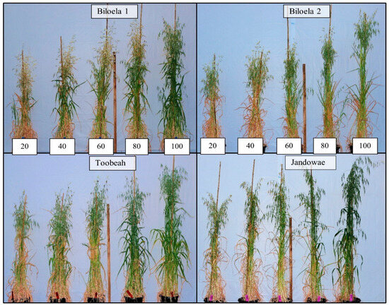 Plants were grown to maturity in a greenhouse under ambient conditions of 23/12 ± 2 °C thermoperiod under a natural day/night photoperiod, and 60 ± 5% RH, determined by TGP-4520 Tinytag Plus 2 logger (Gemini Data Loggers Ltd., Chichester, UK). The soil water content of the pots was maintained at a gravimetric 100% PAWC until panicle initiation (for Biloela 1 and Biloela 2, the panicle emergence took place 58 days after planting; for Toobeah it was 63 days; and for Jandowae it was 65 days). At this time, the various soil water stress treatments (Table 2; six pots were used per biotype per treatment) were imposed and continued until harvest. After panicle initiation, it took approximately 4, 3, 2, and 1 days for 20, 40, 60, and 80% PAWC treatments, respectively, to dry down to their target soil water levels. The soil water content of the pot was determined by weighing each pot every 2 days. To account for the weight of the growing plants, extra plants were grown under each treatment and sacrificed at panicle initiation, and thereafter at 10-day intervals until maturity, to determine an above-ground plant weight. The soil water content of the pots was maintained according to the weight of the pot and considering the weight of the plant.