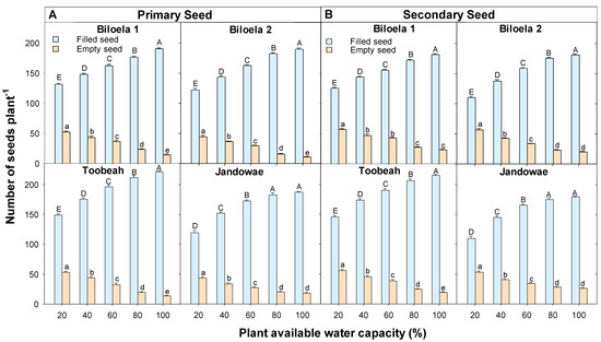 The interaction effect between biotypes and soil water stress treatments was found to significantly impact the number of filled (p < 0.001) and empty (p = 0.002 and 0.010, respectively), primary and secondary seeds produced (Figure 5). Within a biotype, a plant that produced the lowest number of filled primary or secondary seeds also produced the highest number of empty primary or secondary seeds (Figure 5). A plant grown under severe drought stress produced 34% less filled, but three-and-a-half-fold empty seeds compared to control plants (i.e., 100% PAWC). When the severity of soil water stress was reduced, the number of filled seeds produced increased while empty seed production decreased (Figure 5). The filled secondary seed production rate of all biotypes was always found to be lower, and the empty secondary seed production rate was always found to be higher, than their primary seed production (Figure 5).