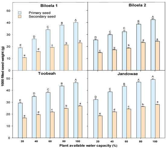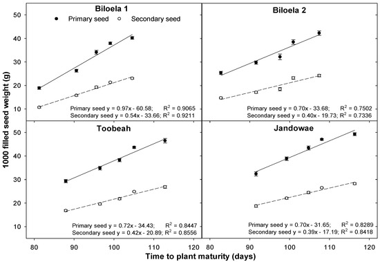 A significant two-way interaction between the biotypes and soil water stress treatments was found in reducing the seed mass of both types of seed (p < 0.001). Among biotypes, the seed mass of Biloela 1 was affected the most under the severe drought stress treatment. The mass of both types of seed of this biotype was reduced by more than 50% under the 20% PAWC compared to its control (Figure 6). On the other hand, Jandowae produced larger-sized primary and secondary seeds in the control (Figure 6). However, the seed mass of this biotype was reduced by 34% under the 20% PAWC treatment compared to its control. A positive effect was also observed between the plant’s maturity time and the mass of both types of seed (Figure 7). The seed weight of all biotypes was reduced as the time to plant maturity was reduced with the severity of soil water stress increased (Figure 7). The seed mass of all biotypes was less affected when the plants were grown under their optimum conditions (Figure 7).