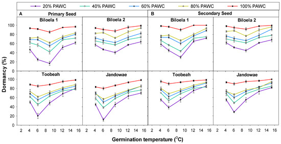 The ANOVA test showed that constant incubation temperatures of 6 °C (p = 0.005), 9 °C (p = 0.003), and 15 °C (p = 0.018) significantly increased the germination of primary seeds from all four biotypes produced under soil water stress treatments (Figure 8). The optimum germination temperature for the southerly originated biotypes was 6 °C whereas it was 9 °C for the northern biotypes (Figure 8). Primary seeds of Biloela 1, Toobeah, and Jandowae biotypes, produced under severe drought stress, expressed little dormancy (80% germinated) when incubated at their optimal germination temperature. On the contrary, only 10% of the primary seeds of those biotypes were able to germinate at the same incubation temperature when plants were grown under the control environment (Figure 8). However, Biloela 2 consistently showed a strong hull-imposed dormancy at any given temperature. The germination rate or the dormancy status of the primary seeds produced under other soil water stress treatments were almost similar for the northern and southern biotypes at their optimal incubation temperature (Figure 8). The dormancy trend of secondary seeds was found to be similar to that of their primary seeds (Figure 8). Nevertheless, the dormancy rate of secondary seeds produced under severe drought stress was always 15 to 20% higher than their primary seeds under their optimum incubation temperature, which was seen in all biotypes except Biloela 2 (Figure 8).