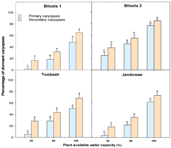 When seeds were dehulled and placed under an optimum incubation temperature, soil water stress treatments were found to have a significant role (p < 0.001) in breaking the dormancy of both primary and secondary caryopses (Figure 9). Overall, the germination rate was very high when seeds were produced under severe drought stress, their hull removed, and they were incubated under their optimum day/night temperature of 15/5 °C (Figure 9). More than 90% of primary caryopses coming from the 20% PAWC environment were able to germinate, whereas 75% germinated in the case of secondary caryopses (Figure 9). However, the caryopses’ germination rate was decreased, and the dormancy rate was increased, when the plants were grown under a 60% or above PAWC treatment. The dormancy rate of the caryopses varied depending on their growing environment, as well as the types of seed present (Figure 9).