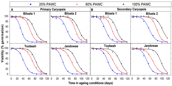 A laboratory-based controlled ageing test (CAT) was conducted to determine the potential seedbank longevity of primary and secondary seeds coming from 20, 60, and 100% PAWC treatments. For this purpose, 12 replicates (Petri dishes) of 20 primary and 20 secondary caryopses coming from 20, 60, and 100% PAWC treatments of all four biotypes were used in both years. The CAT was conducted according to the method described by Long et al. [27] but with the following modifications: (a) 20 primary or secondary fresh caryopses were placed into each glass vial; (b) instead of an oven, an incubator (Model: Polar 1000, Contherm Scientific Ltd., Hutt City, New Zealand) was used for the pre-equilibrium phase (7 ± 2 °C and 47 ± 2% RH for 21 days), as well as for the ageing phase (48 ± 2 °C and 60 ± 3% RH); (c) caryopses were kept in darkness in both phases; (d) Tinytag Plus 2 data loggers were used to monitor temperature and RH conditions inside the sealed boxes; and (e) during the ageing phase, glass vials were removed at 0, 5, 16, 30 39, 55, 70, 85, 100, and 118 days to examine their viability by incubating caryopses for 21 days under 15/5 ± 1 °C, light/dark (12/12 h) photoperiod, and with an addition of 10 μM of gibberellic acid (GA3; Sigma-Aldrich Pty. Ltd., Macquarie Park, NSW, Australia) at a rate of 5 mL per Petri dish to overcome dormancy issues. The germinated caryopses were counted as viable and non-germinated caryopses were considered dead. The number of viable caryopses was plotted against time to determine their P50 value (predicted time for seed lot viability to fall to 50%).