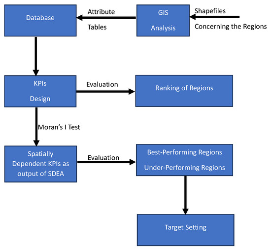Benchmarking analysis is an evaluation of performance that compares different under-study units (i.e., the 12 coastal regions) and provides efficient outputs of how efficiently a unit is performing on different subjects. One way to make rational, ideal evaluations is by setting key performance indicators (KPIs) [32]. These are numbers or percentages that reflect the phenomenon (e.g., scale of urbanization, sprawl phenomena, etc.). Besides the adequate overall “picture” that KPIs provide about the performance of each unit, they cannot capture the spatial spillover effects that affect the phenomenon of urban growth.