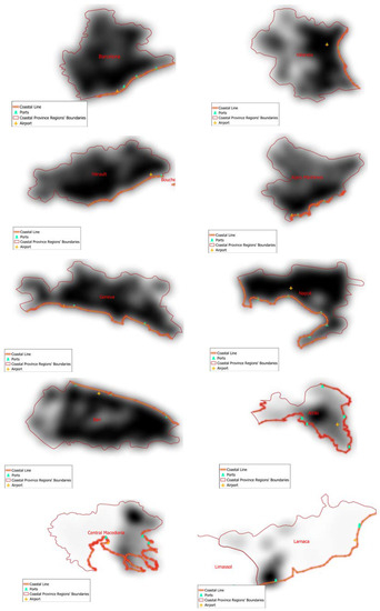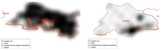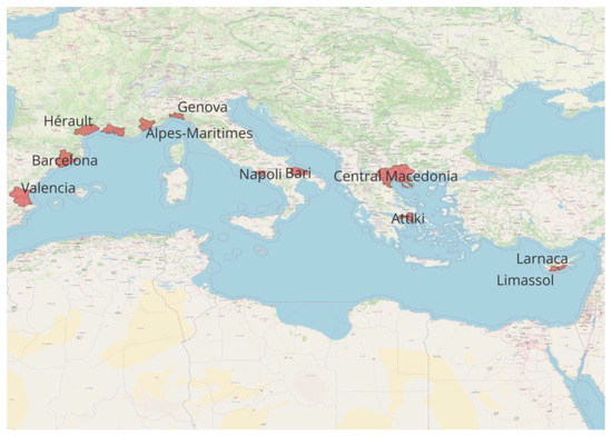This study was developed by collecting geoinformation concerning 12 coastal regions from five EU countries, namely: Bouches-du-Rhone (France); Alpes-Maritimes (France); Herault (France); Attiki (Greece); Central Macedonia (Greece); Larnaca (Cyprus); Limassol (Cyprus); Bari (Italy); Napoli (Italy); Genova (Italy); Barcelona (Spain) and Valencia (Spain). The criteria for selecting these regions were: coverage of a wide area of the Mediterranean Sea (from west to east); the fact that they at least have one airport or/and one port; and the availability of data.