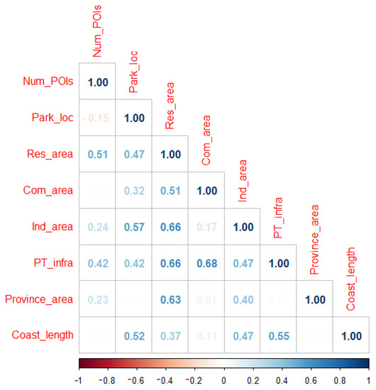 Prior to the implementation of the SDEA method, a correlation analysis was implemented to observe which noncollinear data would be used as inputs in the model. Figure 3 presents the concluded dataset that was used in the SDEA method, which, as can be seen, includes noncollinear variables. Some findings that can be discussed from this figure are that the coastline length of the regions is strongly, but not collinearly (collinear coefficient > 0.7), related to the public transport infrastructure, the number of parking locations, the industrial area and the residential area. This observation indicates that the coastline is indeed related to transport (e.g., public transport infrastructure) and to the region’s land use (e.g., residential and industrial areas). Regarding the correlation between the coastline and industrial use, the significant correlation value can be justified by the fact that the regions that were analyzed in this study have industrial ports, which cover a significant proportion of their coastline length. Additionally, it seems that industrial areas are also correlated to parking locations and residential areas, which might indicate that urbanization is increasing in areas where job positions exist (e.g., industrial areas). As for the public transport variable, it seems that it is correlated with residential areas, commercial areas, the number of POIs, parking locations and industrial areas, so it is expected to observe an increased public network in residential and commercial areas where parking locations and an increased number of POIs exist. Another significant observation from the correlation analysis is that larger regions (province areas) have larger residential and industrial areas, which is also an indication of urbanization.