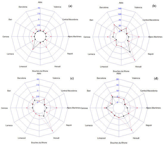 For example, Napoli has the highest percentage of residential land in the total region’s area (KPI 4), the highest percentage of covered residential land by buildings (KPI 3) and one of the lowest values of population per residential land area (KPI 2), which leads to the conclusion that Napoli follows a sprawl model of urban development. On the other side, Limassol and Barcelona have lower percentages in KPI 3 and KPI 4 and larger values in KPI 2, which indicates a dense model of urban development. Combining this information with the correlation analysis, it seems that the coastline has an affection for the model structure, since residential areas are positively affected by the length of the coastline. In detail, as the coastline increases, the residential land area also increases. However, this increment leads to a respective increase in KPI 4 and a decrease in KPIs 2 and 3. The same interpretation can be applied to the rest of the regions.