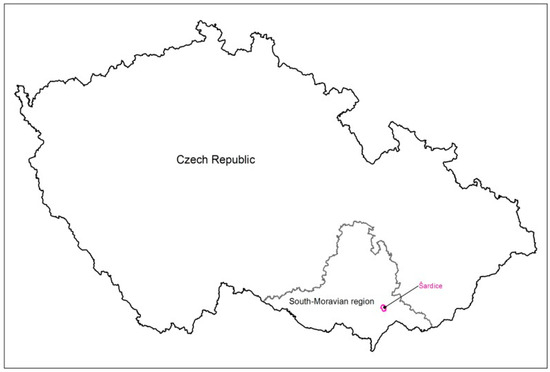 To assess and evaluate the success of the plantings delivered by means of forestry and landscaping methods, a local wildlife corridor (hereinafter as LBK) of a territorial system of ecological stability referred to as LBK 2, situated in the Czech Republic, South Moravian Region, within the perimeter of the municipality of Kyjov, cadastral area Šardice (see Figure 1), was used. The LBK is situated on the right bank of the Šardický brook, which has been significantly modified (straightened and deepened stream bed with trapezoidal cross-section).