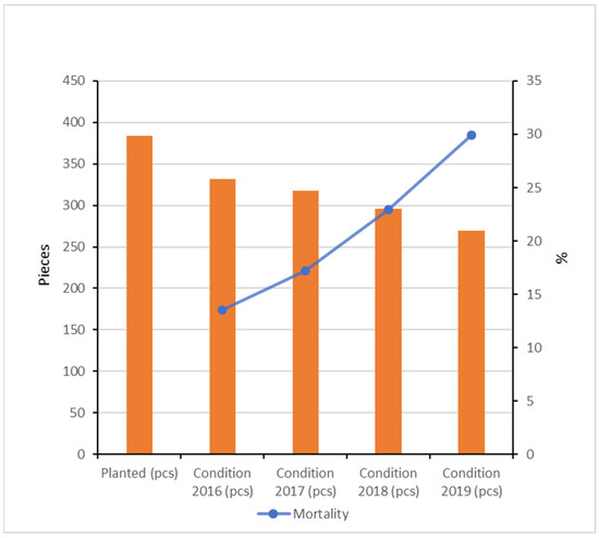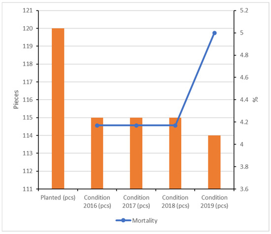 In general, the mortality is very low; for the Acer campestre, Carpinus betulus, Tilia cordata and Ulmus glabra species, it is zero. For Fraxinus excelsior, Populus alba and Quercus robur, it reaches 4.17/12.5/9.09%, which, with the low numbers of the planted trees, represents one dead piece of Fraxinus excelsior and Populus alba each and four pieces of Quercus robur. As per the Populus alba and Quercus robur, these deaths occurred before the start of the measurements (see Table 1 and Figure 4). These results correspond with the finding of Jelínek and Úradníček [37], who, in their partial plots in the Radějov wildlife corridor, recorded zero or just a minimum mortality of one dead piece of Tilia platyphyllos and T. cordata in the form of landscaping stock plants.