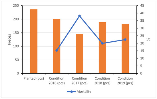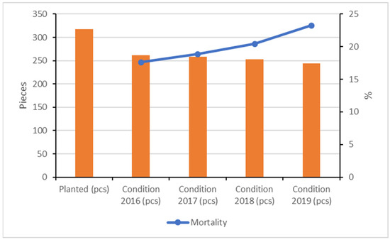 The quantitative characteristics observed included mortality, i.e., number of surviving seedlings in specific positions per the individual observational readings. When processing the field data, a sum of live and dead or missing plants per each species and specific site were calculated. This was done per the individual survey periods. In 2017, 2018 and 2019, the number of live plants was reduced by newly added seedlings to capture the trend of mortality of the seedlings planted earlier. The quantity values in pieces were converted to percentages when the number of planted pieces of a species on a specific site was taken as the initial state (100%). From the percentage of the live plants, the mortality of the species was determined per the plot per each survey period as compared to the initial state. Similarly, the summarization per all the plots by planting type was performed. Per each species, sum of all the plants (live vs. dead and missing) was performed on all the plots of the given planting type per the individual survey periods. Again, a conversion to percentage was performed for the mortality of each species in a given time period. The next step was a summarization of all the plants per the given planting type. The procedure was the same as in the previous steps.
