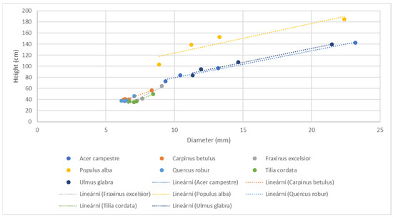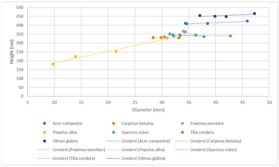 As follows from Table 5 and Table 6 and Figure 8, the vitality of the plants planted in the landscaping mode is significantly lower than that of the plants from the forestry planting method. A regular diameter and height increment is demonstrated only by Populus alba, whereas Ulmus glabra and Acer campestre demonstrate rather just the trunk diameter increment; the vitality of the other species is low. Table 7 shows the coefficients of determination of the trends of linear regression given in graphs of Figure 7 and Figure 8 in particular. It confirms the statement mentioned above.