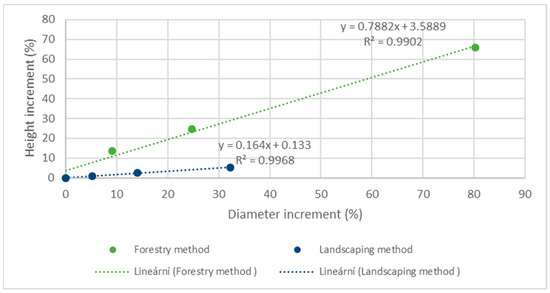 A comparison of the overall vitality of the plants from both the planting methods in the monitored period through comparing relative diameter and height increments is presented in Figure 9.