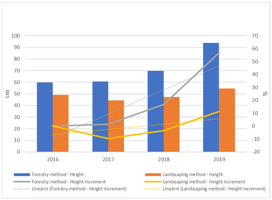The fact that the sprouts were classified as living plants and their height was measured partially influenced the overall height of the species (in particular in years 2016 and 2017) that stagnated (37.66 to 38.18 cm) until 2019 when a more significant increase in the value occurred (46.19 cm, i.e., by 22.66% compared to the initial state and by 21.29% inter-annually). This increase is again partially influenced by the faster-growing sprouts. Stagnation in the height increase after planting and consequent gradation was also recorded by Jelínek and Úradníček [37], in whose study the average height of oak seedlings in their monitored wildlife corridor in Stříbrnice was just 33.6 cm four years after planting, whereas after seven years, it had grown to 62.4 cm (by 86%).
