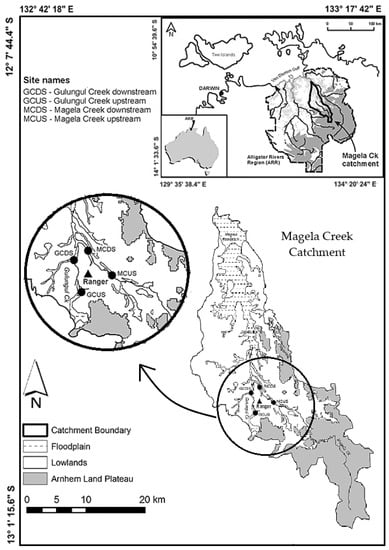 30. Saynor, M.J.; Houghton, R.; Erskine, W.D.; Smith, B.L. Cross Section, Scour Chain and Particle Size Data for Gulungul and Ngarradj Creeks: 2006 to 2009; Internal Report 574; Department of Environment, Water Heritage and the Arts, Supervising Scientist, Australian Government: Canberra, Australia, 2010. [Google Scholar]