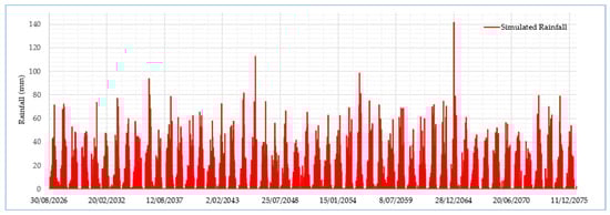 Since the 30-year future time series cannot be joined to make longer continuous time series, rainfall projections for this study were taken from a different data set. Future rainfall simulations for this study shown in Figure 5 were taken from a project on Tom’s Gully, which is 100 km away from Ranger mine [38]. The study used the WGEN weather simulator [39] to generate a 1000-year continuous daily rainfall series from year 2025. WGEN is a stochastic weather generator which uses monthly and annual statistics to generate daily time series of precipitation, minimum temperature, maximum temperature, and solar radiation. In the absence of on-site observation data, long-term daily climate data from 1957 to 2019 were sourced from the SILO Australian climate online database and used as reference in WGEN.