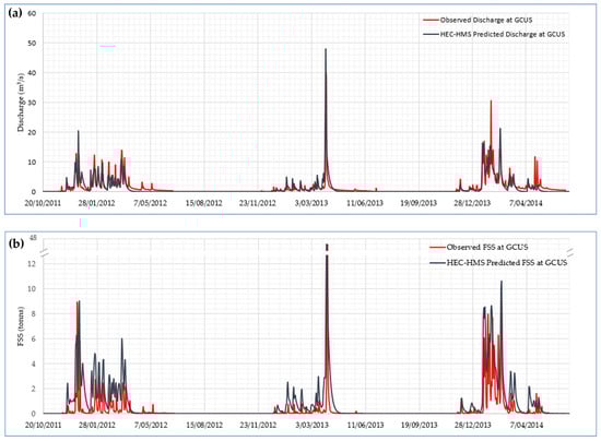 Figure 6a,b thus compare the calibrated model output to the observed data for discharge and FSS, respectively. The efficiency of the calibrated model to match the observed values is determined by Nash–Sutcliffe Efficiency (NSE) number generated at the end of each simulation. The NSE value is computed as in Equation (5).
